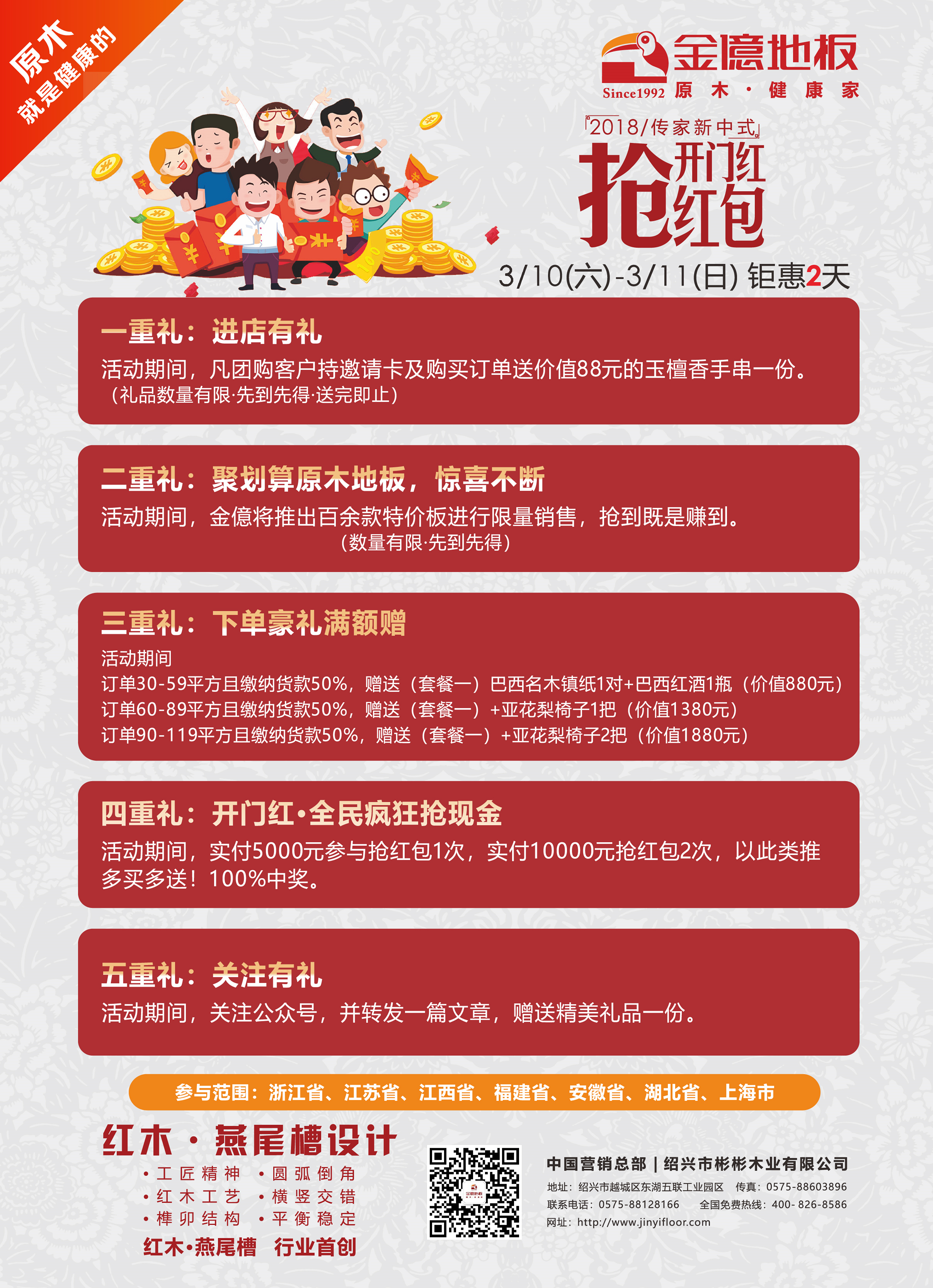 時間一晃而過,過完了熱熱鬧鬧的春節,我們又迎來了新的一年工作之中。2018年,擼起袖子,加油干! 3月金億地板工廠團購活動 “開門紅-搶紅包 旺財迎春,旺禮high不停” 如約而至。
